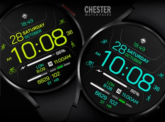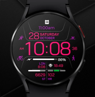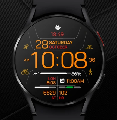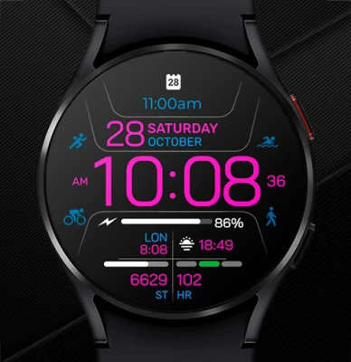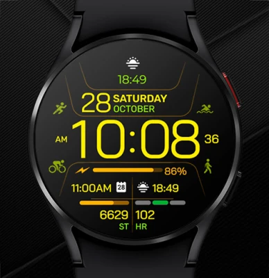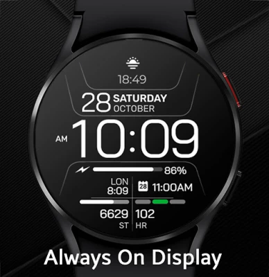 Main functions: - Date and day of the week. - Four application selection zones for quick access. - Four zones to display selected information. - Twenty-five colors. - Three AOD modes. - Multilingual.