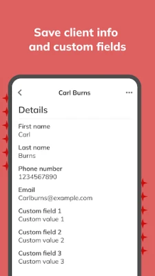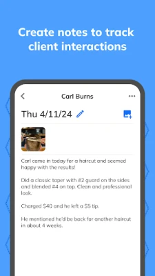 Clients are added to a searchable list similar to a contacts app. When adding a new client, you can enter information such as email, phone number, and any custom fields you’d like to keep track of across clients. Once a client is created, notes can be added for each client through typing or dictation. Photos relevant to your business? Add images to remember visuals on any note.