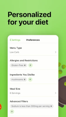From classic, flexitarian, pescetarian, low carb, paleo, keto, vegetarian & vegan diet types to gluten-free, shellfish free, fish free, dairy free, peanut free, tree nut free, soy free, egg free, sesame free, and mustard free allergy restrictions to 119 individual dislikable ingredients, your meal plans will be truly personalized to your specific needs.
